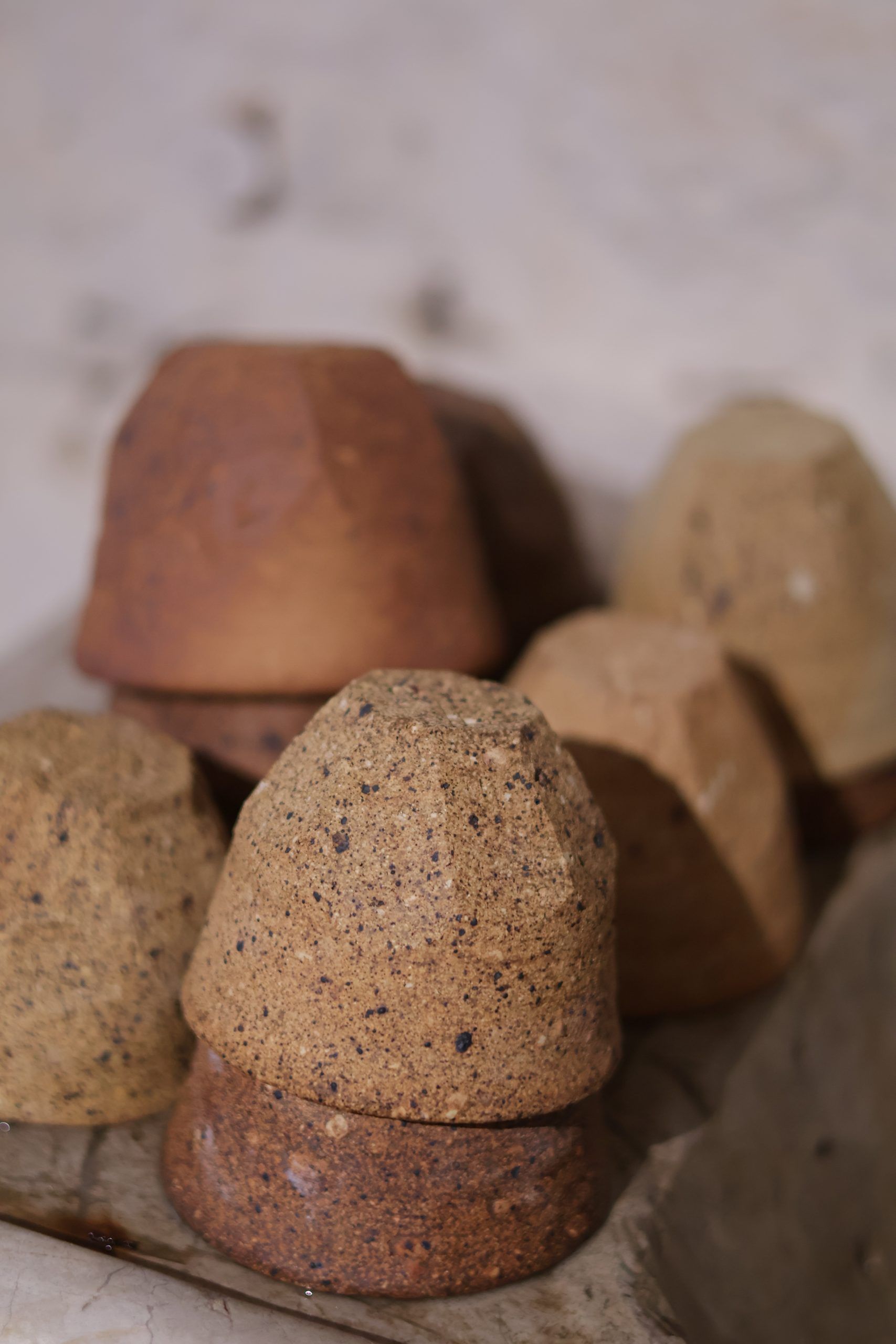 Tasses fetes d’argila salvatge Etrusca, d’aspecte lleuger, textura pedrenca i esperit mediterrani. Recullo l’argila en brut, filtro només les pedres més grans, deixant les més petites i les impureses pròpies de la terra, per a que el material conservi el seu caràcter.